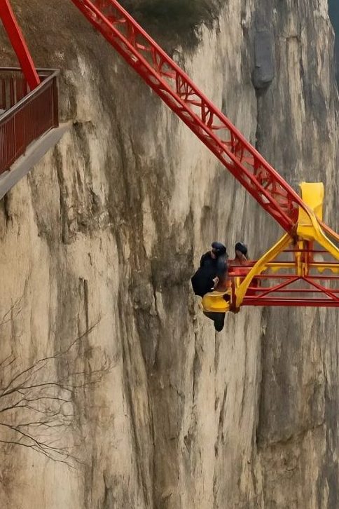 Halfway down, the emergency brakes kicked in. Sparks flew, metal crashed, and the platform halted — hanging dangerously close to the ground. Trapped above, passengers knew the danger wasn’t over.