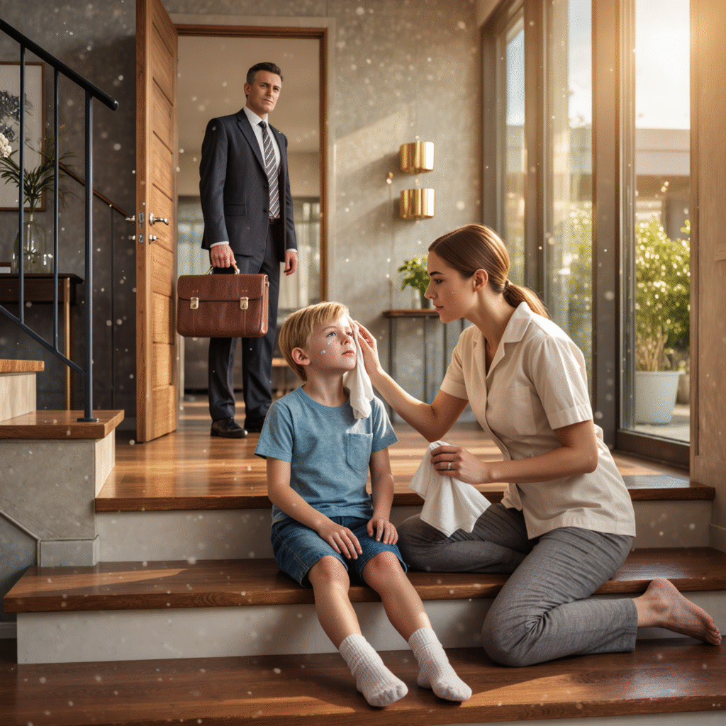 On the staircase sat his eight-year-old son, Oliver—small, tense, eyes glossy with tears. A purple bruise shadowed his cheek. Kneeling in front of him was Grace, their caretaker, holding a cool cloth to his skin with the kind of tenderness that turned the foyer into something sacred.