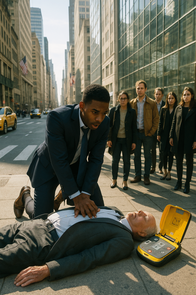 Seconds turned into minutes. Sweat stung his eyes. The crowd watched in stunned silence until someone brought over a portable defibrillator from a nearby office. David followed the prompts, pressed the pads to the man’s chest, and delivered the shock.
