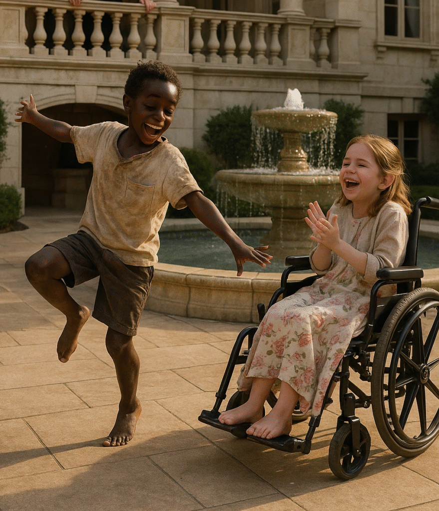 Years later, the garden remained sacred. The fountain trickled, the roses bloomed, and laughter once again filled the air. Emily, still in her wheelchair, had grown into a confident young woman. Leo, once barefoot and hungry, thrived as her brother—full of the same playful spirit that had saved her.