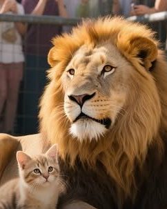 The lion towered above it now. His vast shadow swallowed the trembling kitten. He bent down, his breath ruffling the kitten’s fur. Then, came the roar—deep, resonant, and powerful.