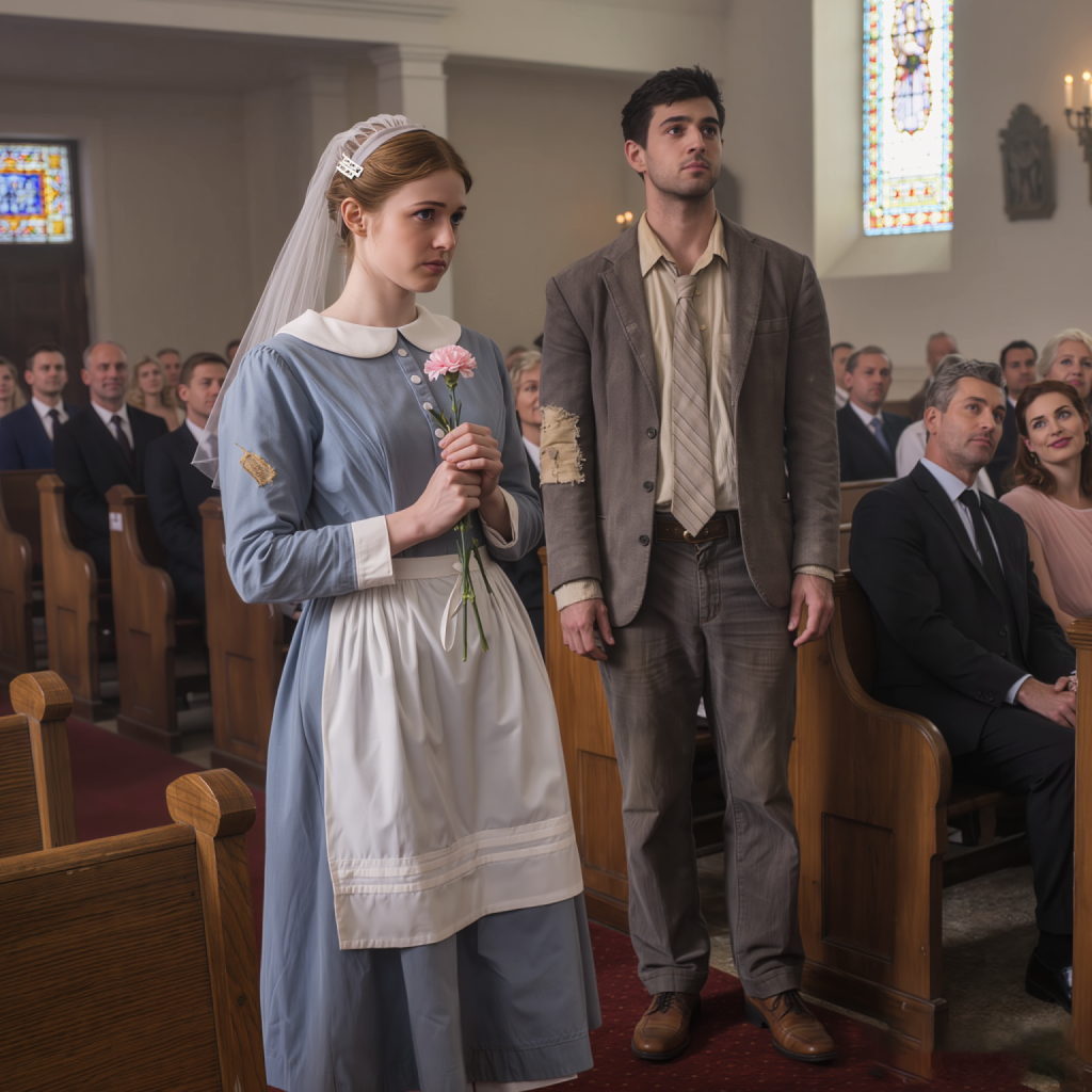 Emily Parker, a young nanny, stood at the altar in a simple blue dress. Her veil was pinned with trembling fingers, and in her hands she held a single pink carnation — the only flower she could afford.