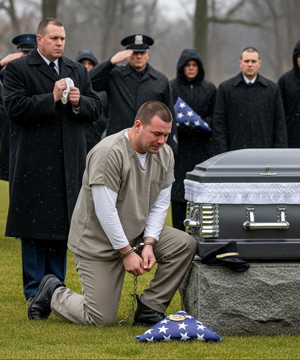 Engines idled. Doors opened. He stepped out in a prison uniform, wrists linked by steel, head bowed. Murmurs rippled: It was his call. His mistake. His fault. The escort made a path. He stopped at the coffin where a badge and cap rested like a promise.
